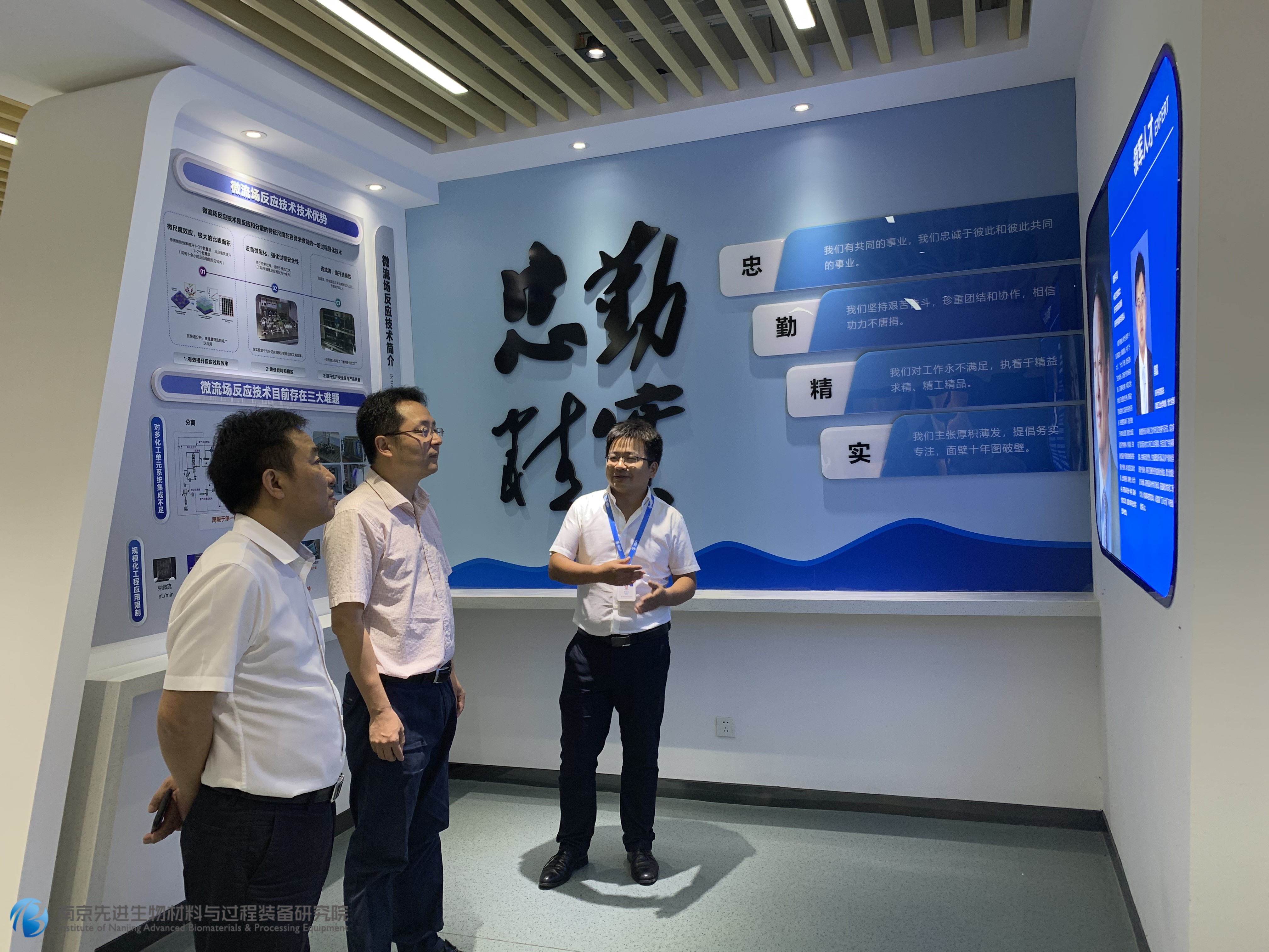在工藝研發(fā)和分析實(shí)驗(yàn)室,郭院長就實(shí)驗(yàn)工作、項(xiàng)目進(jìn)展、院校合作等內(nèi)容給在場(chǎng)領(lǐng)導(dǎo)作了陳述。